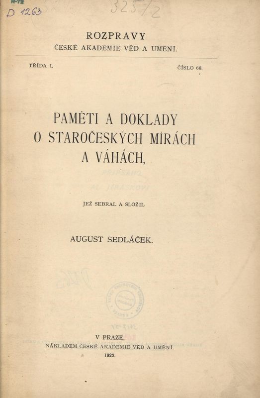 SEDLÁČEK, August. Paměti a doklady o staročeských mírách a váhách. Praha : Česká akademie věd a umění, 1923. 498 s.; čb. obr.