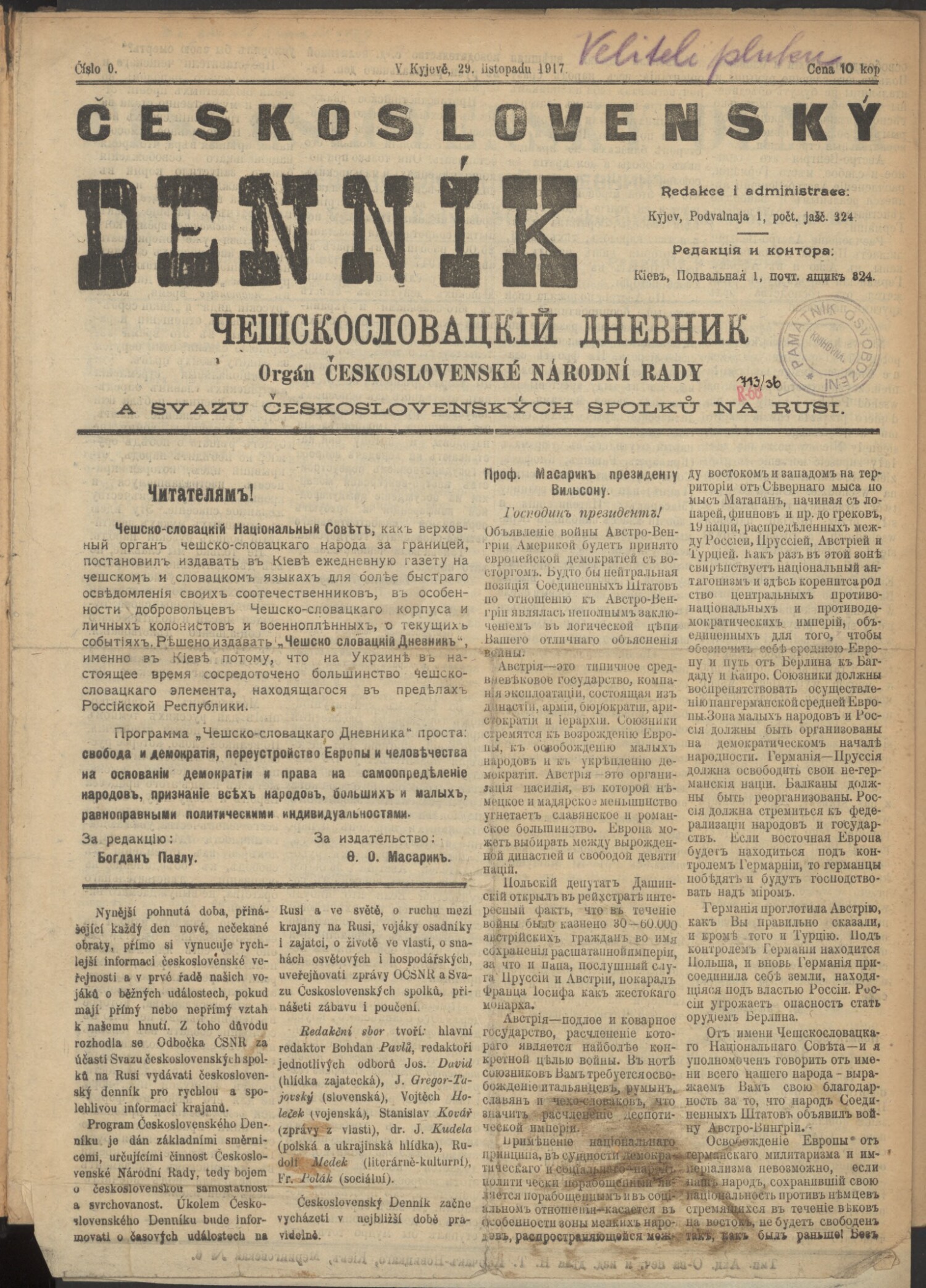 Hlavním redaktorem byl zprvu Bohdan Pavlů v Kyjevě, později se však redakce i tiskárna v návaznosti na překotné události v Rusku a čs. hnutí často stěhovaly. Již v polovině února 1918 se přemístily do Pirjatina, aby po dvou týdnech byly naloženy do železničních vagónů a společně s čs. vojskem opustily Ukrajinu. Ve vlaku pak list provázel čs. legionáře na jejich anabázi Ruskem přes Penzu až do Omska. Odtud na krátkou dobu přesídlil do Čeljabinska, aby se opět vrátil do Omska. Nikde ale nezůstal příliš dlouho a byl vydáván většinou na nádražích a v železničních vagónech.