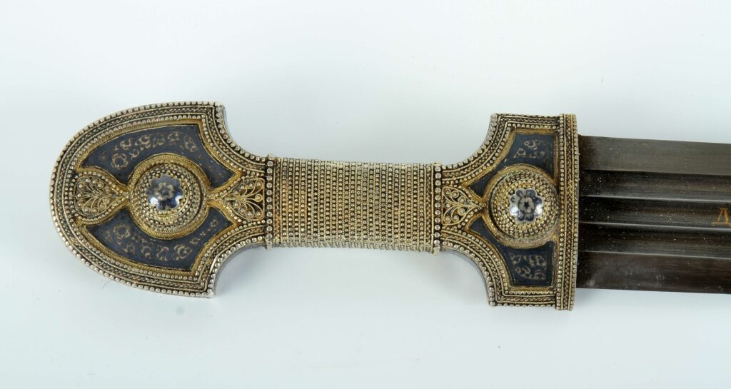 Kinžál se stal součástí kavkazských národních krojů a velké obliby dosáhl zejména u kozáckých vojsk, kde se vedle známější šašky stal druhou poboční zbraní jejich příslušníků. Dýka, jejíž vznik můžeme zasadit do počátku 20. století, má celkovou délku 437 mm a je opatřena 318 mm dlouhou a 35 mm širokou čepelí s oboustranným ostřím, stýkajícím se v ostrém hrotu. Na vnější straně má čepel tři výbrusy, které jednak snižují hmotnost zbraně a činí ji tak lépe ovladatelnou, ale mají také nezanedbatelnou funkci estetickou. V prostředním výbrusu je zlatem tausovaný nápis „ДВА РАЗА НЕ БЬЮ“ (Dvakrát neudeřím), staré ruské úsloví, které se užívá dodnes a vyjadřuje přesvědčení, že druhou ránu již nebude protivníkovi potřeba zasadit. Stejný nápis se nachází např. na čepeli kinžálu z roku 1851, který věnoval generálporučík kníže Bebutov caru Mikuláši I., a jenž je v současné době uložen ve sbírce Carského Sela. Na vnitřní straně čepele je vyražena zlacená výrobní značka čočkovitého tvaru, která je provedena arabským písmem a zní „Amal Hasan“ (vyrobil Hasan). Bližší údaje o tomto výrobci nejsou známy, bezpochyby se však jednalo o špičkového řemeslníka své doby, který pracoval pro nejvýše postavené osobnosti. To dokládá jiný exemplář, který byl v červnu 2014 dražen ve 45. aukci známého italského aukčního domu Czerny´s International Auction House pod číslem 251, a který byl Hasanem prokazatelně vyroben pro ruského cara Alexandra III. (1845–1894, vládl v letech 1881–1894).