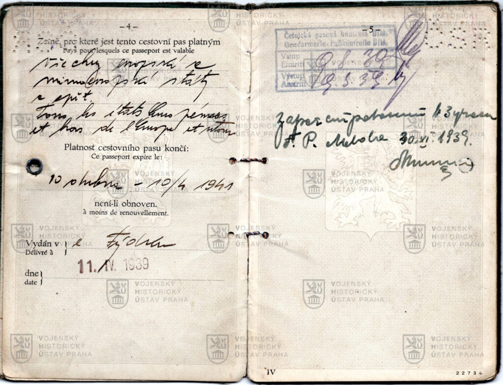 Prezentovaný cestovní pas Česko-Slovenské republiky byl vydán ve Frýdku 10. dubna 1939 s platností na dva roky. Podle data vydání a zbytku lepidla na deskách byl původně přelepen protektorátními úřady, ale při pozdějším používání byly přelepky opět odstraněny.