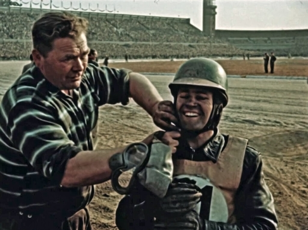 Na závěr slavnostního odpoledne seskočili z vrtulníku Mi-4 na plochu stadionu parašutisté Gustav Koubek, Zdeněk Kaplan a Jaroslav Jehlička, kteří nedlouho předtím v březnu 1957 skokem ze stratosféry ustavili světový rekord v délce volného pádu.