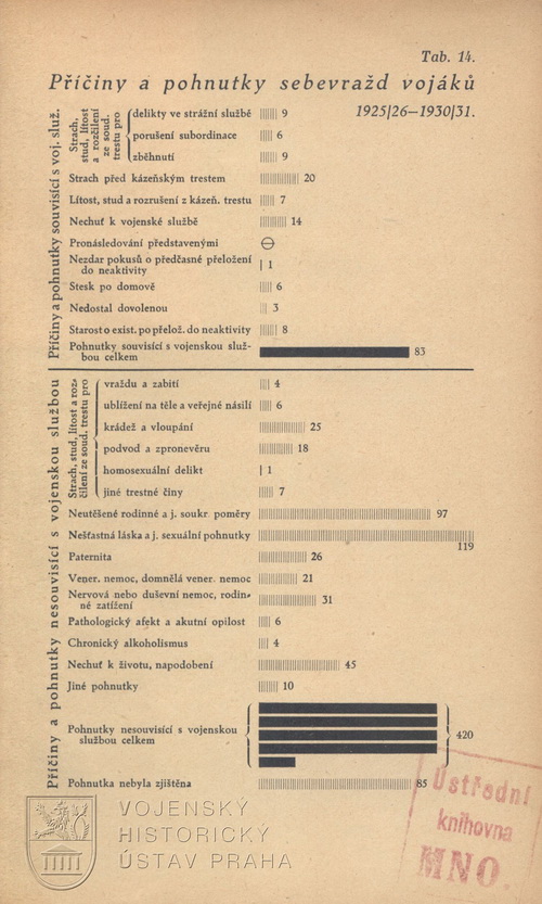 V roce 1932 vyšla pod patronátem Svazu čs. důstojnictva v textové podobě přednáška generála šéfa zdravotnictva MUDr. Ludvíka Fishera o problematice sebevražd. Autor však neorientoval svůj výklad, jak by mohl název napovídat, čistě na prostředí armády, avšak pojal záměrně fenomén sebevraždy z celospolečenského hlediska, neboť na základě svého výzkumu nepovažoval armádu za činitele, který by v Československu výrazně ovlivňoval množství sebevražd. V jeho pojetí jsou sebevraždy v mírovém vojsku pouze vyústěním patologických duševních stavů jedinců, kteří si stejně tak mohli sáhnout na život při jakémkoliv jiném psychickém tlaku, který byl na jejich osobu vyvíjen.