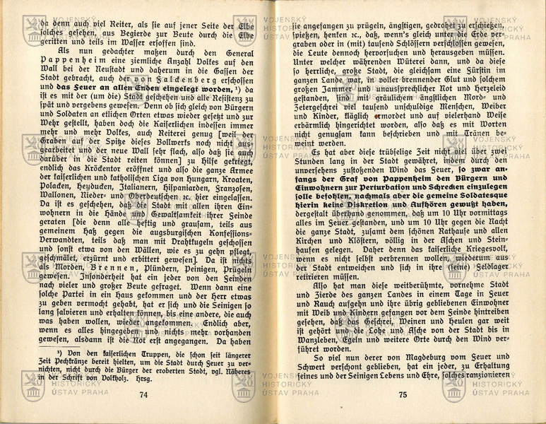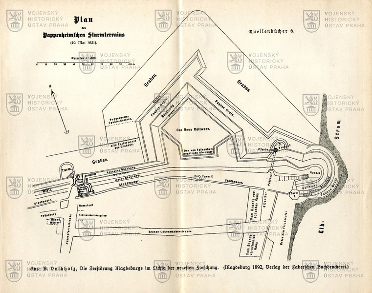 Guericke, Otto von, Die Belagerung Eroberung und Zerstörung der Stadt Magdeburg am 10./20. Mai 1631 : nach der Ausgabe von Friedrich Wilhelm Hoffmann ; neu heurausgegeben von Horst Kohl. Leipzig : Voigtländers Verlag, [1912]. 83 s., [3] l. obr. příl. : čb. obr. (Voigtländers Quellenbücher ; Bd. 6)