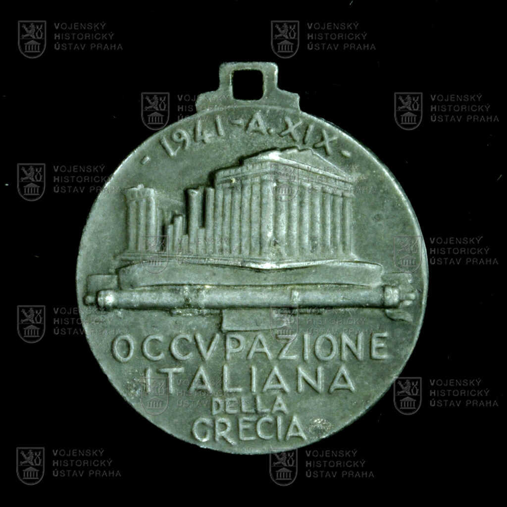 Prezentovaná kruhová medaile o průměru 34 mm a o síle 3 mm je ražena ze zinkové slitiny. Je bez stuhy, s průvlečným uchem v horní části. Na averzu se v ploše bez bordury nachází v heraldicky pravé polovině orel sedící na horizontálním bidýlku. Otáčí se hlavou k heraldicky levé polovině plochy, kde pod svým rozepjatým křídlem schraňuje mapu Řecka s vyznačeným hlavním městem Athény. Dělený opis obsahuje dvě slova: ROMA zcela nahoře a DOMA zcela vespod. Při heraldicky levém dolním okraji medaile lze spatřit značku výrobce Franceska Giannoneho. Na reverzu se v horní polovině plochy nalézá veduta athénského Parthenónu, převýšená datací – 1941 – A. XIX – a podložená páskou bez textu a horizontálně položeným fascesem. Ve spodní polovině je dělený bezpatkový nápis OCCVPAZIONE ITALIANA DELLA GRECIA (italská okupace Řecka).