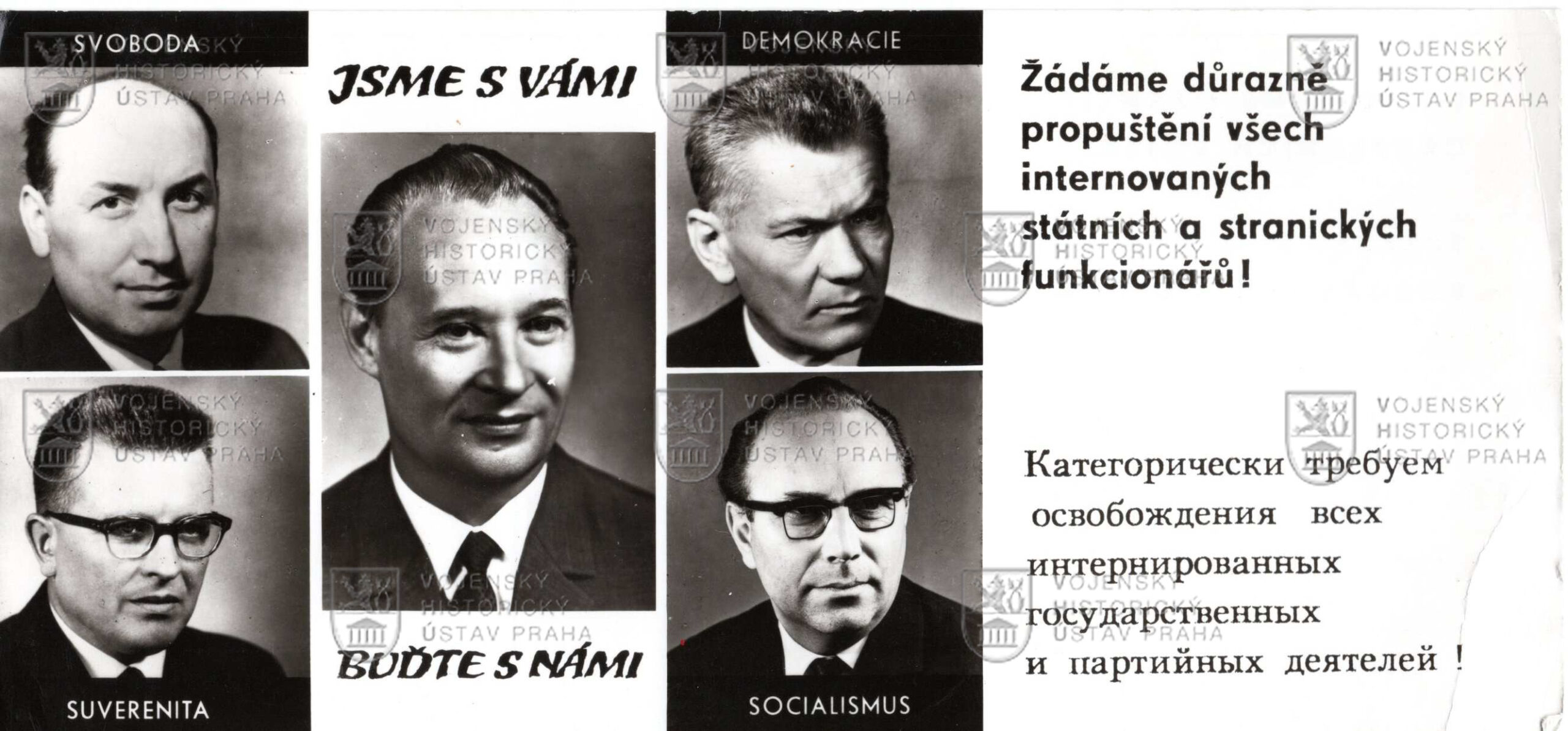 Na prezentované dopisnici jsou otištěny portrétní fotografie pěti politiků, kteří byli považováni za vůdčí osobnosti reformního křídla KSČ během srpnových událostí roku 1968 – Alexander Dubček, František Kriegel, Josef Smrkovský, Josef Špaček a Oldřich Černík. Rubová strana obsahuje nápis v českém a ruském jazyce: „Požadujeme okamžitý odchod okupačních vojsk!“ Podél řádků pro adresáta je ještě velmi podstatný dovětek: „Posílejte okupantům a do ciziny“.