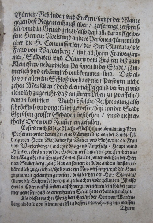 Kurtzer doch gründlicher Bericht, Welcher massen im Königreich Böhmen, das Schloss Gytschin (so zehen Meil wegs von Prag gegen Schlesien zu gelegeu) den 1. Februarii Neuen Calenders, diss instehenden 1620 Jars, durch einen sonderbaren Unfall, bey und off entzündung etlicher Tonnen Büchsen Pulvers, unversehens zersprengt, vnnd hierdurch viel fürnehme Herrn vnd Adelstands Personen, bevorab die abgeordneten Königlichen Herrn Commissarien jämmerlich vmb ihr Leben kommen. [S.l.: s.n.], 1620. [8] s.
