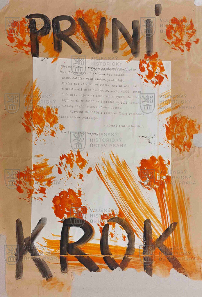Oba prezentované letáky byly vyvěšeny na budově vysokoškolských kolejí v tehdejší Leninově (dnes Kounicově) ulici v centru moravské metropole. Právě tady vznikl a zasedal po událostech 17. listopadu 1989 Stávkový studentský výbor. Dne 24. listopadu 1989 vydali jeho představitelé prohlášení o odstoupení členů ÚV KSČ a další koordinaci stávkové činnosti. Tištěný text prohlášení byl nalepen na balicí papír a doplněn hesly: První krok a Stávka pokračuje.