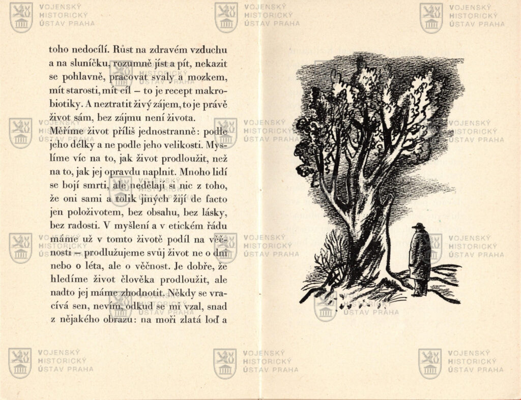 Neprodejný tisk vydaný v den Masarykovi abdikace obsahuje lyrickou esej o stárnutí. Ústředním motivem je úvaha, v níž končící prezident přirovnává stárnutí stromu k ideálu stárnutí člověka. Jeho schopnosti a velikost mají s každým rokem mohutnět, stejně jako devítisetletý dub, ve kterém je více života než v malých stromcích. Text končí symbolickou větou: „Jak bych viděl, že ztrácím některou hlavní schopnost, udělám hned místo mladším.“ Tato věta odráží i konec úctyhodné politické kariéry prvního československého prezidenta.