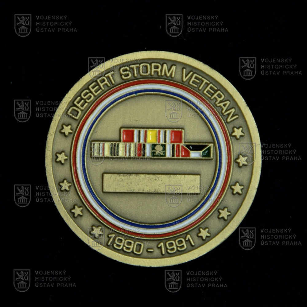 Pamětní mince o průměru 45 mm a síle 3,5 mm je ražena z patinovaného tombaku v povrchové úpravě starobronzu. Na averzu zaplňuje střední plochu bíle, modře a fialově smaltovaná slepá mapa, zabírající území Saúdské Arábie, Iráku a Kuvajtu. V borduře se nachází opis bezpatkovou majuskulou, rozdělený třemi pěticípými hvězdami: PERSIAN GULF WAR, DESERT SHIELD, DESERT STORM.