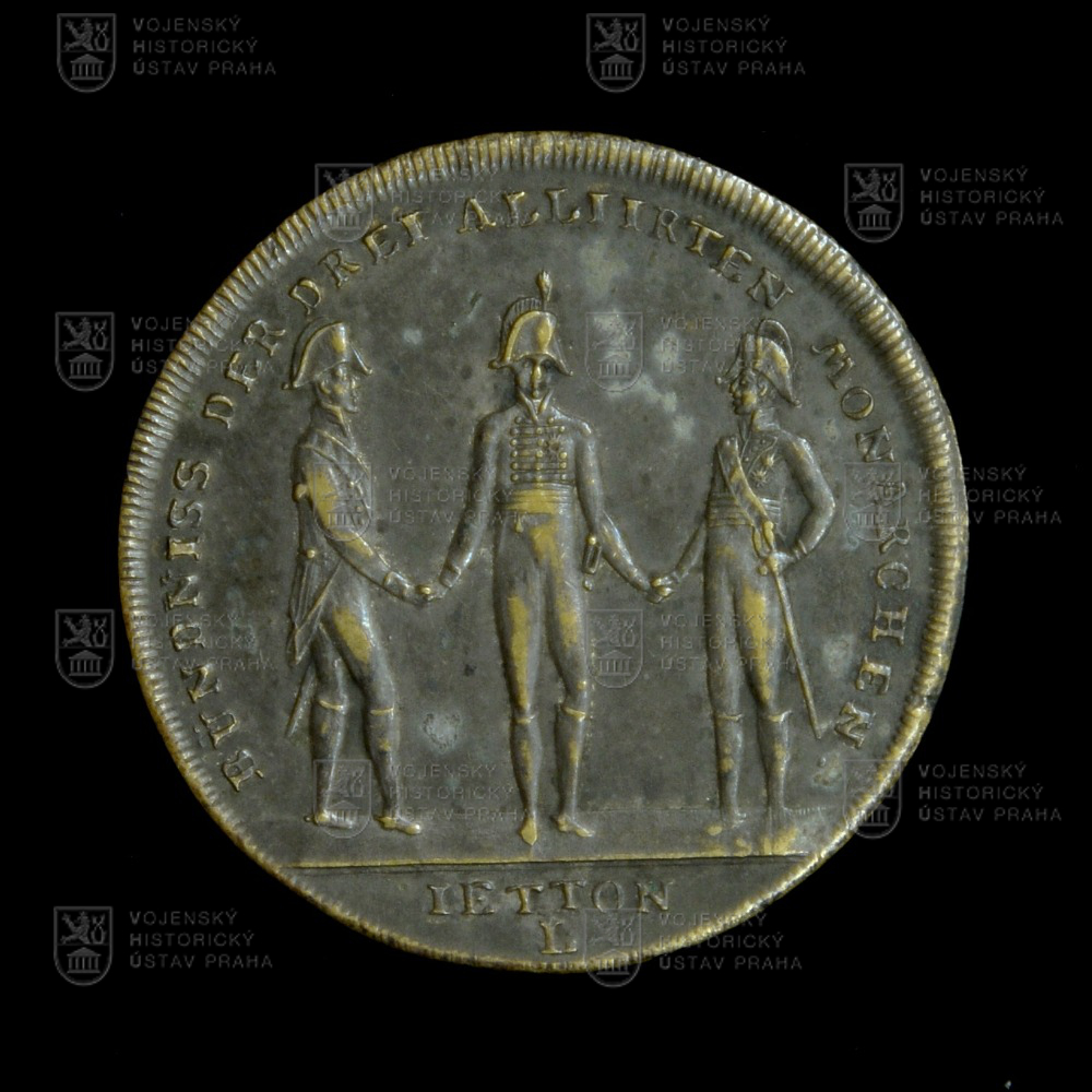 Prezentovaný žeton o průměru 32 mm a síle 2 mm je ražen ze stříbřené mosazi. Na averzu zobrazuje v celých postavách trojici blíže nejmenovaných vládců, držících se za ruce – s vysokou pravděpodobností se jedná o rakouského císaře Františka I., pruského krále Fridricha Viléma III. a bavorského krále Maxmiliána I. Josefa. Opis při okraji plochy zní BÜNDNISS DER DREI ALLIIRTEN MONARCHEN (svazek tří spojeneckých monarchů), zatímco spodní nápis hlásá IETTON I. (odkazuje to na pořadí vůči ostatním propagačním žetonům).