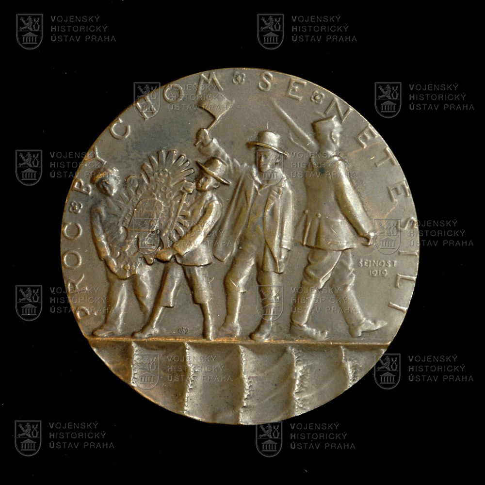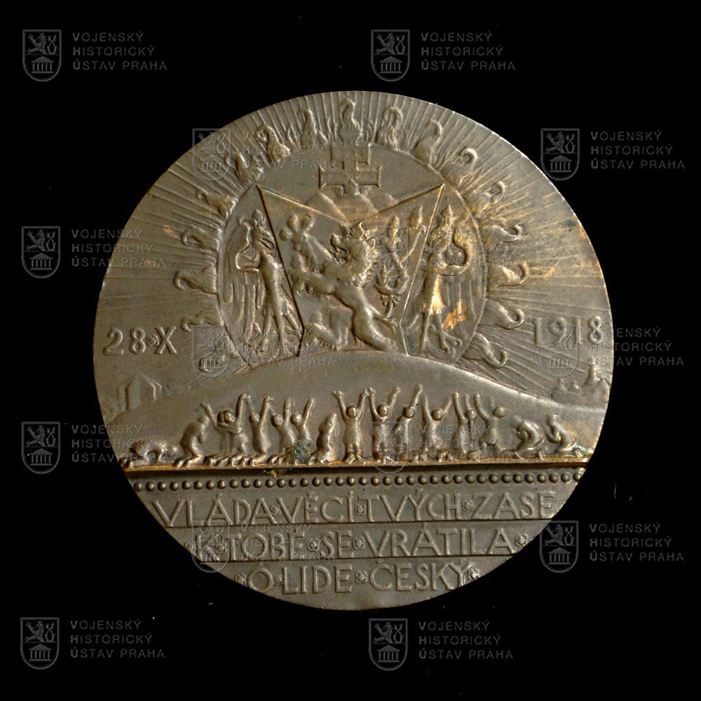 Prezentovaná kruhová medaile o průměru 49 mm a síle 4 mm je ražena z bronzu. Averz vyplňuje zobrazení situace se čtyřmi lidskými postavami. Heraldicky vpravo nesou dva chlapci překlopený rakouský štít s habsburskou orlicí. Ve středu stojí postava muže v klobouku, který mává pravou rukou praporkem nad hlavou. Při heraldicky levém okraji medaile kráčí mimo plochu postava vojáka. Podnoží postav tvoří zvlněná vodní hladina řeky, do níž bude vhozena orlice. Opis při okraji bezpatkovou majuskulou zní: PROČ BYCHOM SE NETĚŠILI (převzato ze Smetanovy opery Prodaná nevěsta). Mezi postavou vojáka a okrajem je drobný nápis ŠEJNOST / 1919. Na reverzu jsou v horní části zemské znaky Čech, Moravy, Slezska a Slovenska ve stylizovaném kotouči vycházejícího slunce. Na paprscích při okraji lze spatřit dělený nápis s datací: 28. X. / 1918. V dolní části plochy se nachází silueta Bílé hory s vedutami letohrádku Hvězda a Pražského hradu při okrajích. Pod horou je klonící se a uctívající dav lidí. Při dolním okraji medaile se táhne třířádkový členěný nápis s mírně pozměněným citátem z Komenského: VLÁDA VĚCÍ TVÝCH ZASE / K TOBĚ SE VRÁTILA / Ó LIDE ČESKÝ.