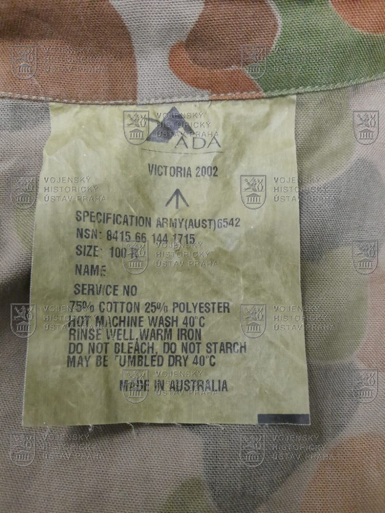 Blůza je vyrobena ze směsového materiálu tvořeného ze 75 % bavlnou a 25 % polyesterem. Má skryté zapínání na knoflíky a dvě navrch našité měchové náprsní kapsy. Představovaný exemplář byl vyroben firmou Australian Defence Apparel ve Victorii v roce 2002.