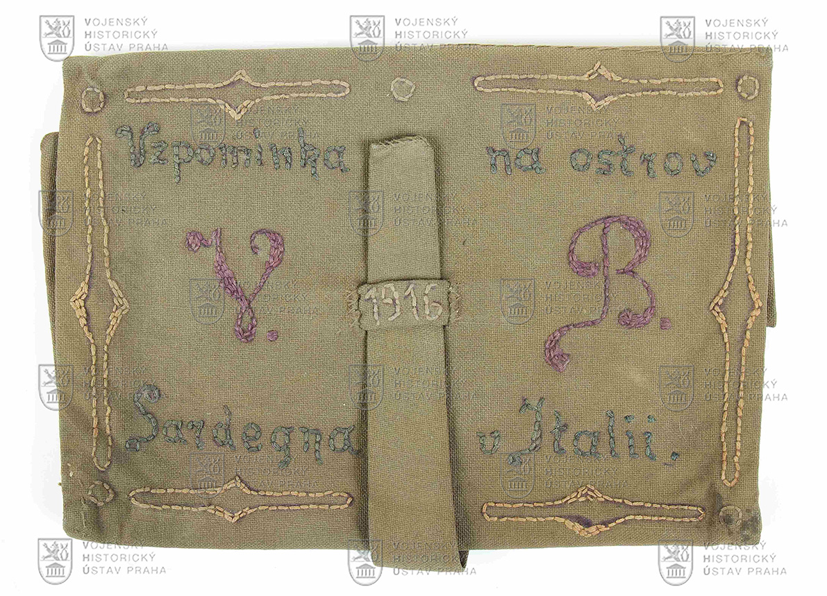 Jednoduché pouzdro na dopisnice z šedozeleného lněného plátna si vyrobil neznámý český zajatec v roce 1916. Písemný styk s domovem představoval pro zajatce důležitou morální vzpruhu, čemuž odpovídala i mimořádná péče, kterou došlé korespondenci věnovali. Podle nápisu lze usuzovat, že voják si pouzdro vyšil zřejmě během pobytu na Sardinii, kam byli zajatci z Asinary převáženi na práce v zemědělství.