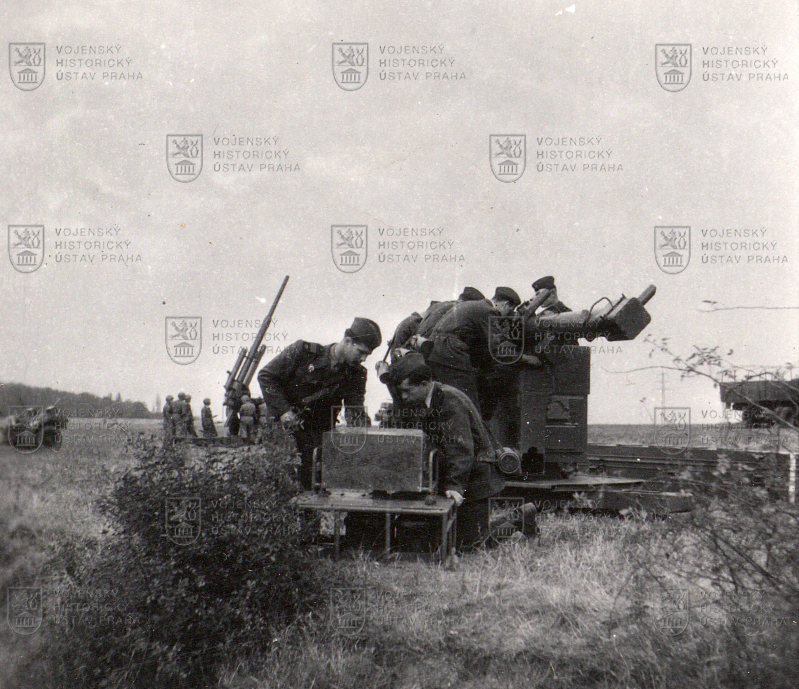 Snímek pochází z ostrých protiletadlových střeleb na počátku padesátých let na Slovensku. Kromě protiletadlového děla 88mm PLK vz. 37N vidíme část vybavení baterie a v popředí obsluhu s dálkoměrem.