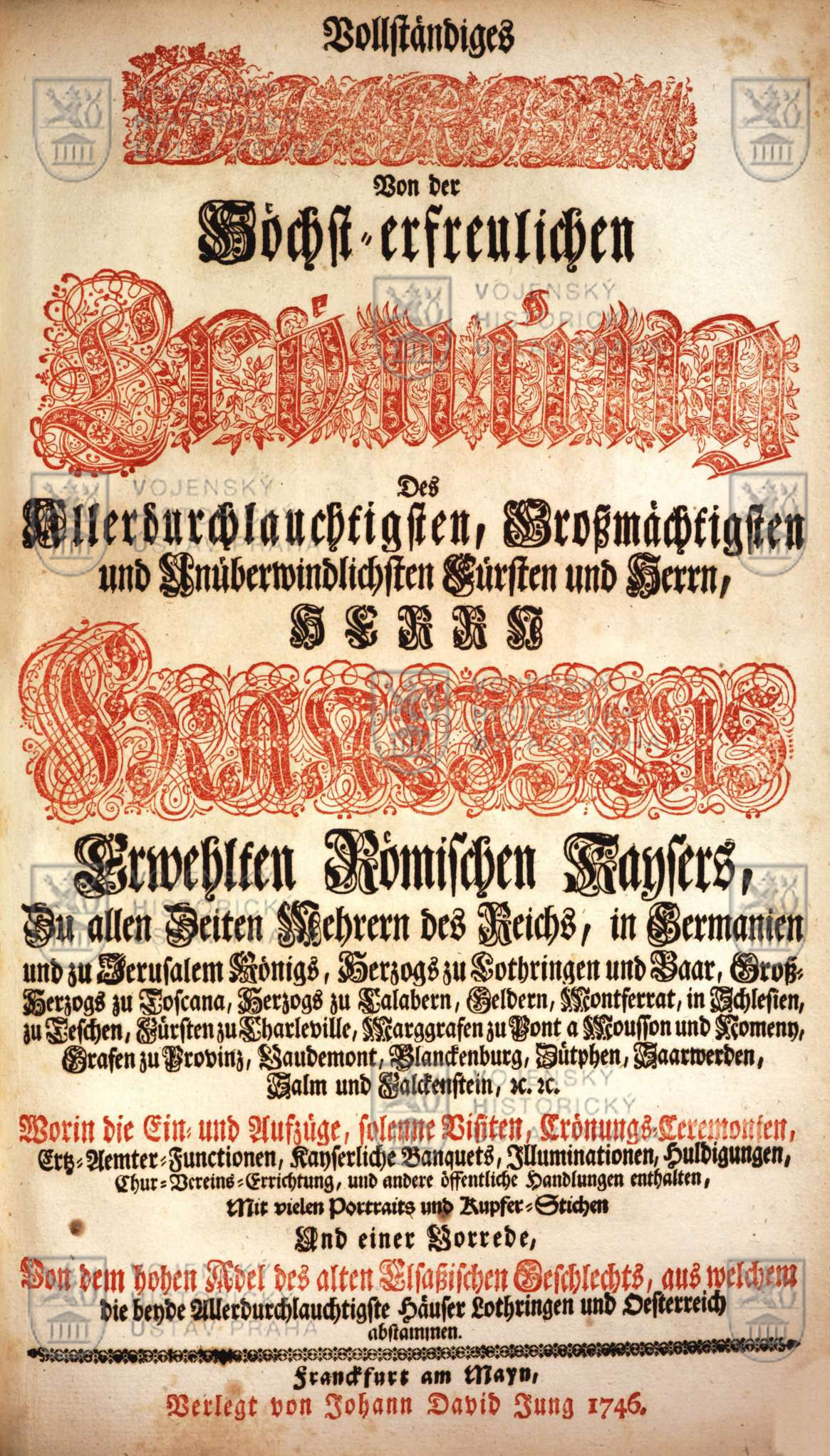 Vollständiges Diarium Von der Höchst- beglückten Erwehlung Des Allerdurchlauchtigsten Großmächtigsten und Unüberwindlichsten Fürsten und Herrn, Herrn Franciscus Königs zu Jerusalem, Herzogs zu Lothringen und Baar, Groß- Herzogs zu Toscana, Herzogs zu Calabern, Geldern, Montferrat, in Schlesien, zu Teschen, Fürsten zu Charleville, Marggrafen zu Pont a Moussan und Nomeny, Grafen zu Provintz Vaudemont, Blanckenburg, Zütphen, Taarwerden, Talm und Falckenstein, etc. etc: Zum Römischen König und Kayser Worin die Merckwürdigsten Handlungen und Begebenheiten enthalten, Mit Kupfferstichen und Schematischen Vorstellungen versehen Nebst einer Vorrede, Von den Vorzügen des Regierenden Hauses bey den Teutschen Königs- und Kayser- Wahlen. Franckfurt am Mayn: Johann David Jung, 1746.