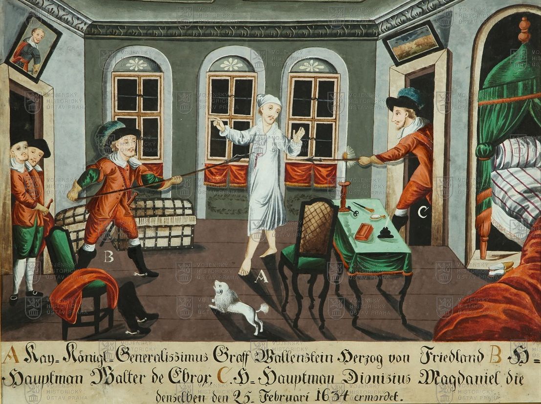 Kopie podle olejomalby Johana Josefa Maxmiliána Hoffreuthera z roku 1736 zobrazuje scénu z osudného večera dne 25. února 1634 v Chebu. Tři hlavní aktéři spiknutí proti Valdštejnovi Walter Butler, Jan Gordon a Walter Leslie vtrhli se skupinou dragounů při masopustní hostině nejprve na starý štaufský chebský hrad. Všichni čtyři Valdštejnovi přívrženci Adam Trčka, Vilém Kinský, Kristián von Ilow a sekretář Jindřich Neumann byli zabiti. Pouze jednomu ze služebníků se podařilo náhodou uniknout. Ten prchal k náměstí, aby oznámil manželkám zavražděných, co se přihodilo.