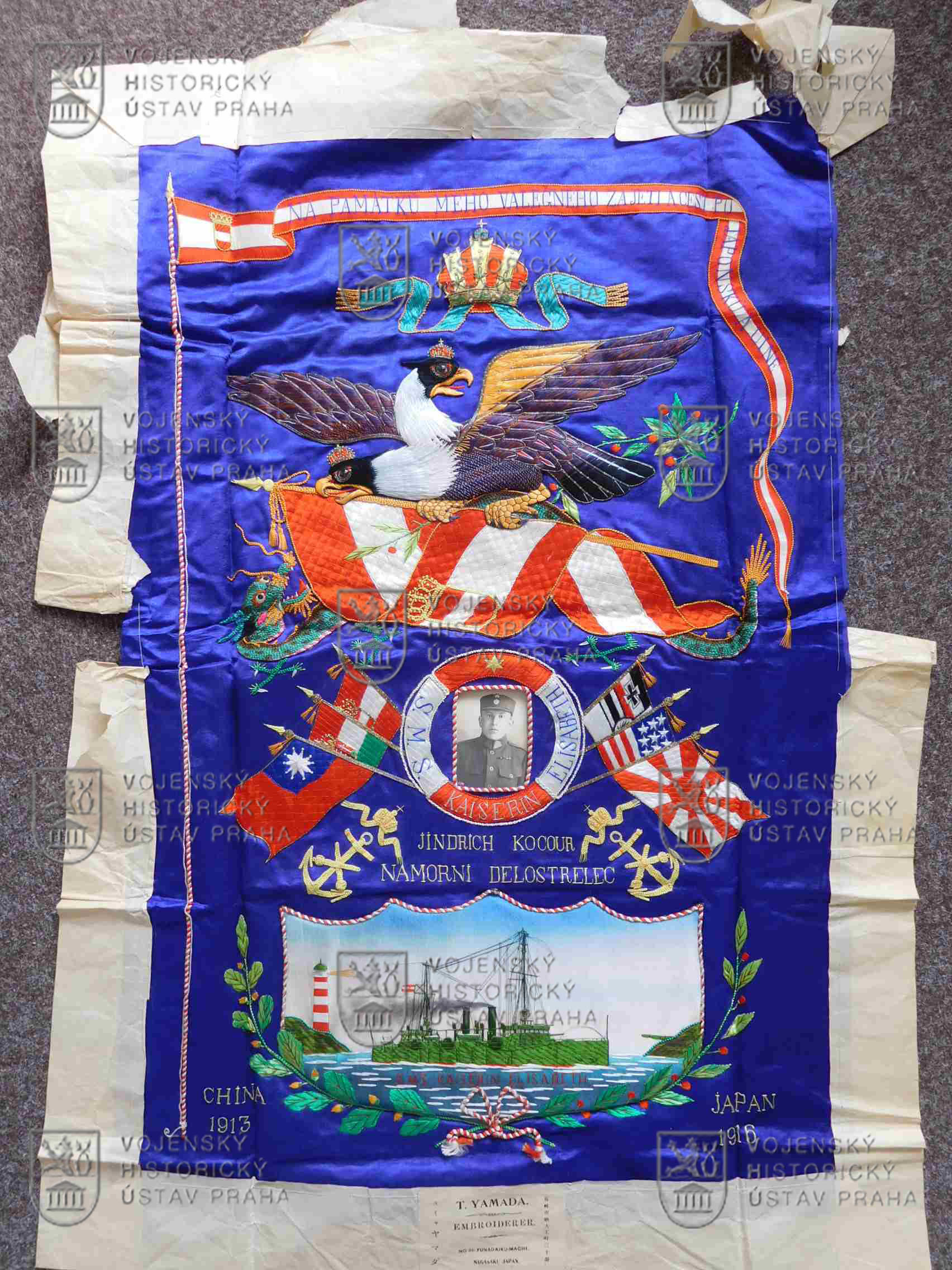 Dečka vytkaná na hedvábném podkladu zachycuje výjev s habsburským císařským orlem, držícím v pařátech srolovanou vlajku rakousko-uherského válečného námořnictva. Pod ní se nachází fotografie olemovaná vlajkami jednotlivých armád účastnících se bojů na Dálném východě. Ve spodní části je obraz křižníku Kaiserin Elisabeth. Zajímavým doplňkem je vlepená fotografie majitele v legionářském stejnokroji a údaje o výrobci, kterým byl T. Jamada z Nagasaki. Obdobné dečky byly mezi námořníky ze zmíněné lodi populární a zpravidla se dočkaly zarámování a umístění na čestném místě v jejich domovech.