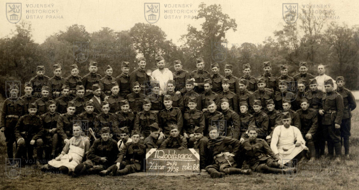 Na fotografii lze spatřit záložníky zdravotní roty, povolané do zbraně během mobilizace v září 1938. Mobilizace a přechod státu do branné pohotovosti byly vyhlášeny vyhláškou č.183/1938 Sb. z. a n. ze dne 23. září 1938. Plný text zněl: „Vláda republiky Československé vyhlašuje podle § 57 odst. 1 a 3 zákona ze dne 13. května 1936, č. 131 Sb. z. a n., o obraně státu, den 23. září 1938, jimž byla nařízena presidentem republiky podle § 23 branného zákona mobilisace, za den vstupu státu Československého do branné pohotovosti. Jan Syrový v. r.“
