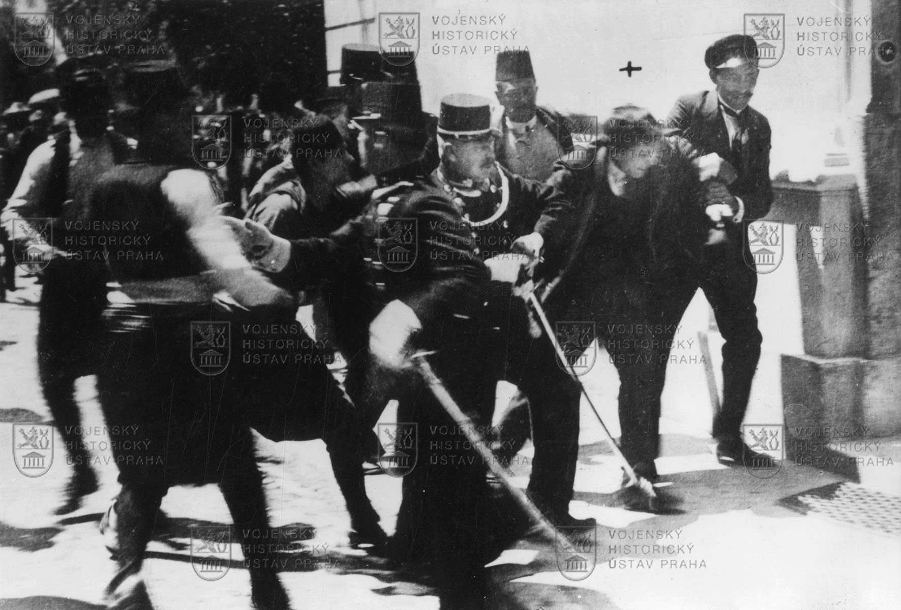 Snímek zachycující zatýkání Nedjelka Čabrinoviće během atentátu na Františka Ferdinanda d'Este