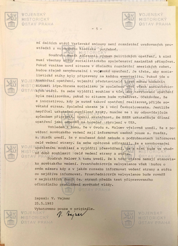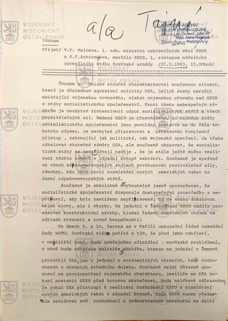 Podle písemného záznamu přijal G. Husák ve středu 25. května 1983 v 15.00 prvního zástupce náčelníka generálního štábu Sovětské armády maršála SSSR Sergeje Fjodoroviče Achromejeva a prvního náměstka ministra zahraničních věcí SSSR Viktora Fjodoroviče Malceva. Schůzka se uskutečnila na vyžádání těchto vysoce postavených hostů, kteří si již předem přáli, aby jejich přílet do Prahy zůstal utajen. Setkání se dále zúčastnil jen Vratislav Vajnar, tehdejší vedoucí sekretariátu generálního tajemníka, který pořídil v jediném exempláři zápis.