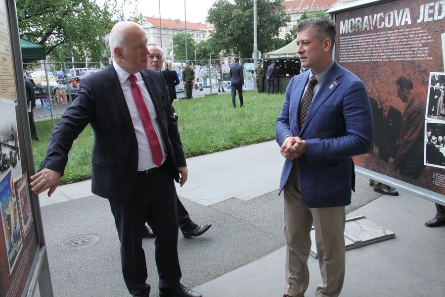 Poté došlo na slavnostní společné přestřižení pásky výstavy, kterého se ujali generál Aleš Opata, senátor Pavel Fischer, náměstek ministryně obrany Tomáš Kopečný a Zdeněk Špitálník.
