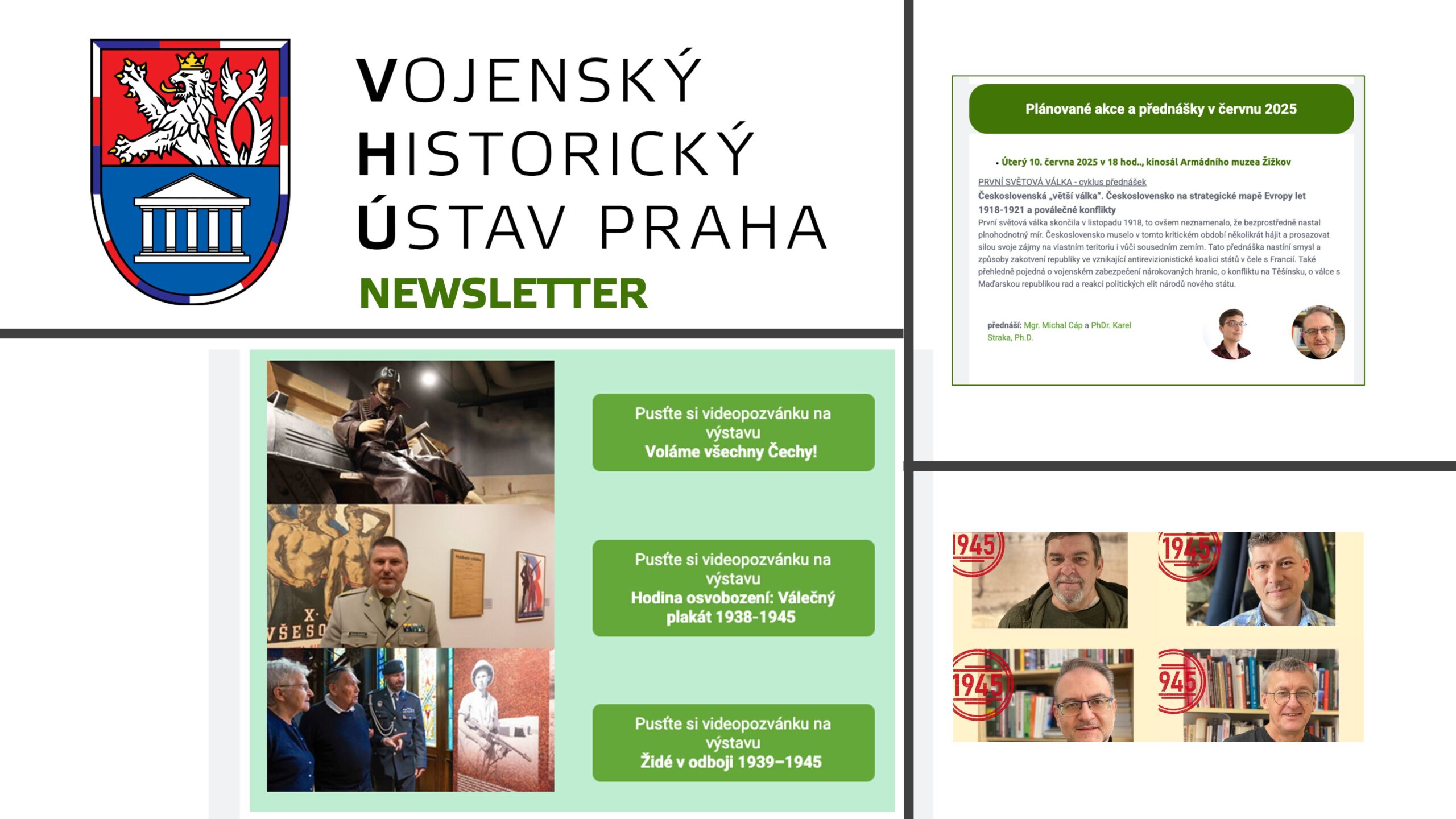 Newsletter Vojenského historického ústavu Praha přináší každý měsíc přehled připravovaných výstav a událostí, upozorňuje na nové články a publikace a představuje zajímavosti ze sbírek i výsledky badatelské práce. Pokud se stanete odběratelem, upozorníme vás vždy měsíc předem na to nejdůležitější, co se u nás děje a zároveň vám nabídneme odkazy na více informací o připravovaných akcích.