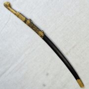 Curved single-edged blade with both-sided fuller and central point. Both sides are richly decorated with etched ornaments and inscriptions. Military trophies on the outer side, a flower ornament, a person on a horse and inscription “technické oddělení československých vojsk Jekatěrinburk v prosinci 1918” (technical department of Czechoslovak armed forces, Yekaterinburg,December 1918). The inner side bears similar decorations and the following inscription “Prvému českému ministru národní obrany Generálu Štefánikovi” (To the First National Defence Minister General Štefánik). The back bears the manufacturer’s mark “Златоуcт. oружейная фабрикa”. All-metal hilt of gilded brass. Over the total length it is richly decorated with relief flower and linear ornaments. The inner side of the head bears a plastic monogram “MŠ”. The outer side of the grip bears two cut gems. The head is forked in shape of a bird’s beak. Wooden scabbard covered with leather. Chape of gilded brass decorated with relief and cut flower ornaments. Inner side of the upper chape bears the inscription “SVÉMU DRAHÉMU MINISTRU ČESKOSLOVENSKÉ VOJSKO NA RUSI URAL SIBIŘ VÁNOCE 1918” (To Our Dear Minister from the Czechoslovak Armed Forces in Russia, Ural, Siberia, Christmas 1918).