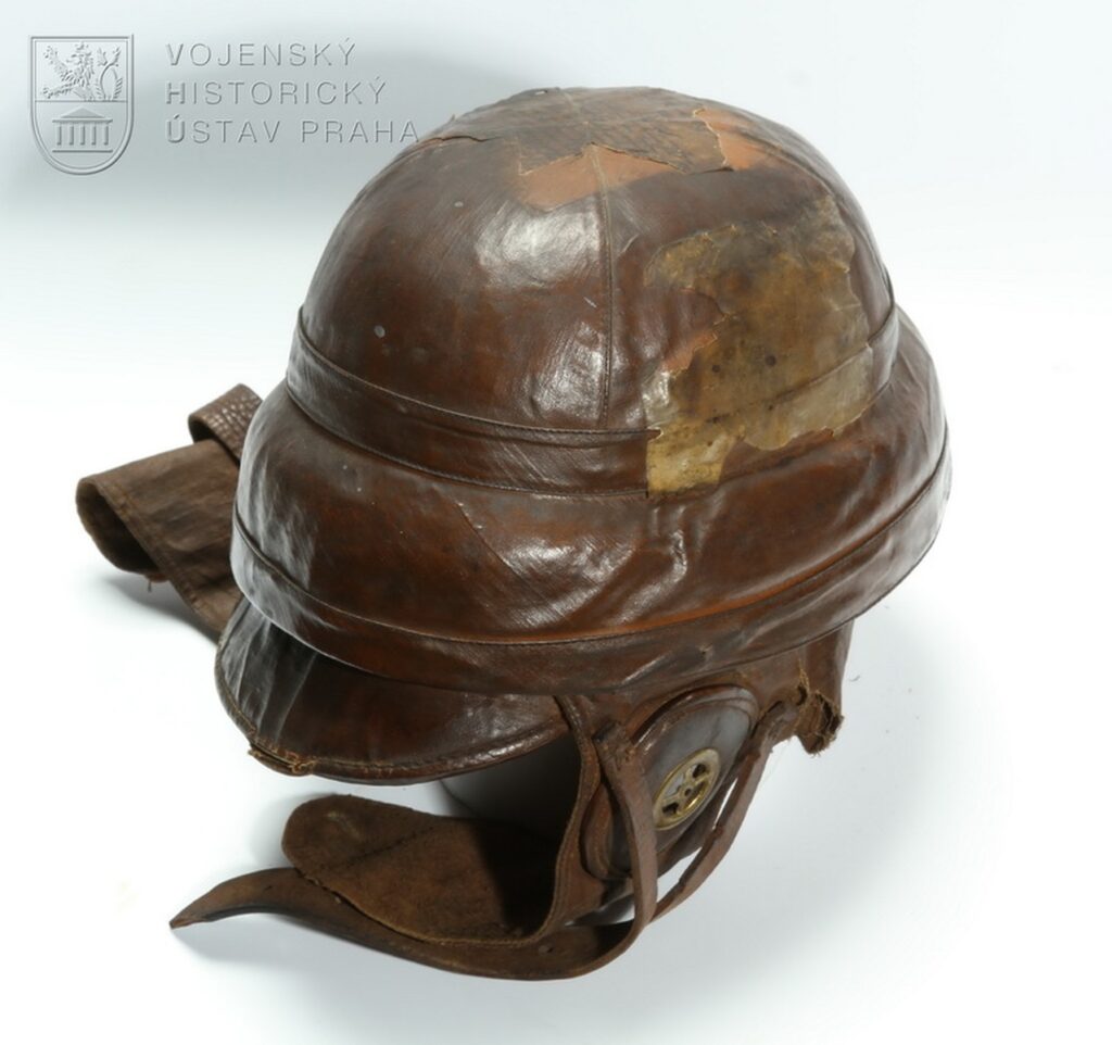 One of the first protective helmets of the French Air Force was manufactured by the Paris-based company ROOLD, founded in 1911. The helmet achieved considerable distribution among a majority of conventional air units and was a welcome prey even with enemy pilots. The users of this helmet counted a number of Czechoslovak legionary pilots. The body is made of glued cork, covered with waxed, brown lacquered canvas. Thanks to its shape, the helmet provided partial head protection from impacts. It was often supplemented with a face mask to protect the pilot from bad weather. Brass holes were cut on the ears to allow better communication in the aircraft. This example was captured by German pilots after the downing of a French fighter in 1918.