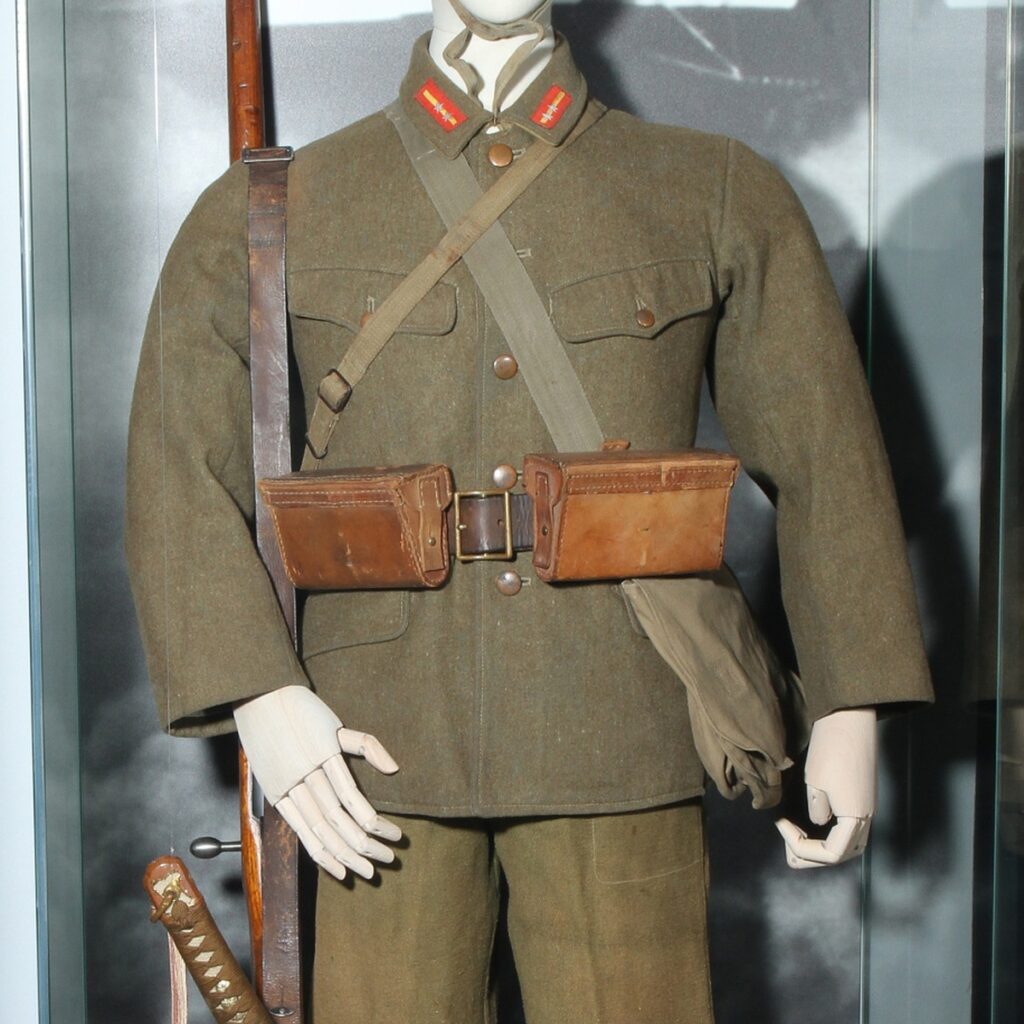 The Japanese Imperial Army used two basic cuts of uniforms during World War II. The older Model 90 (1930) with a lying collar and the more modern M98 (1938). Both types were produced in summer cotton and winter wool versions. This sergeant’s uniform jacket (GUN SO) is an example of the winter Model 98 and was made in 1942. The uniform was brought back as a trophy from Okinawa by an American soldier, a member of the 7th Infantry Division. The jacket was acquired for the collections of the Military History Institute in Prague by purchase from a family member in 2009.