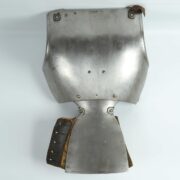 The backplate is composed of two parts, a plain plate to which a narrow culet piece with leather flaps on the sides is bolted. This leather extension was used to fix the tournament culet to the body with leather straps. There are two holes in the centre of the upper back, probably used to attach the clamping mechanism of the tournament helmet. The remains of the straps in the upper part of the backplate (in the shoulder area) are not original. The connection to the front part of the backplate in this type of armour was usually secured with metal belts with a pin and a cotter pin, as is also evident from the preserved holes in this part of the backplate.
