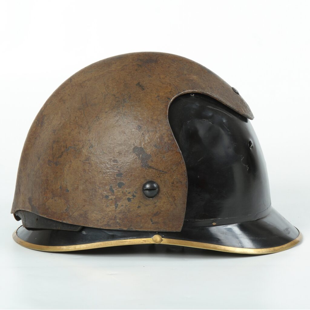 In 1915, the dragoon helmet became the basis of improvised head protection when a steel protective cover was added. The plate was made of 4 mm thick sheet metal and according to tests, it could withstand a rifle shot at 100 m. The manufacturer was probably the Böhler brothers’ factory in Kapfenberg. The crest and brass insignia were removed from the original dragoon helmet. The helmet was subsequently fitted with a steel cover attached to the rosettes of the scaly chin guard. The helmet modified in this manner was worn in reverse, i.e. with the original faceplate at the rear. However, this simple and inexpensive solution did not have the expected effect and it was necessary to take a different route in the development of suitable head protection.