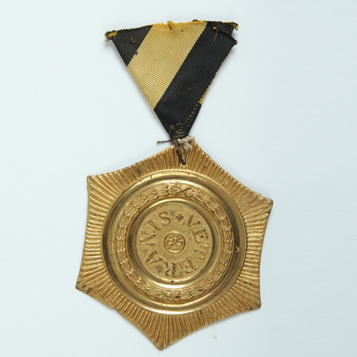Vojenští veteráni, kteří v novověku přežili mnohaletou vojenskou službu včetně válek a jiných bojových operací, požívali přinejmenším od 18. století jisté úcty a určitých finančních výhod, drobné renty nebo zajištěné živnosti. Císař Josef II. nechal v této souvislosti pro vojenské veterány zřídit odznak, jenž měl být vnějším znakem osobních zásluh těchto mužů za dobu odsloužených let. Tyto dekorace byly nošeny od roku 1780 až do roku 1849, kdy došlo k jejich zrušení. Odznaky existovaly v několika provedeních - za 8 a 16 let služby – obvykle perforované na několika místech kvůli přišití, podložené červeným suknem a přišité k uniformě. Prezentovaný exemplář je perforován pouze na jednom místě ve spodním cípu a poněkud nestandardně zavěšen vzhůru nohama na trojúhelníkovitě poskládané náprsní stuze.