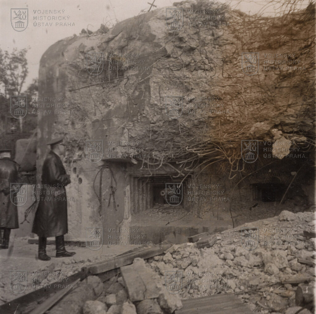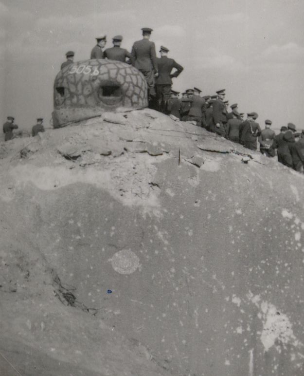 Slovenský důstojník si prohlíží poničený objekt Blocku 2 pěchotní tvrze La Ferté, která byla součástí Maginotovy linie. Poškození bylo způsobeno intenzivní dělostřeleckou palbou.