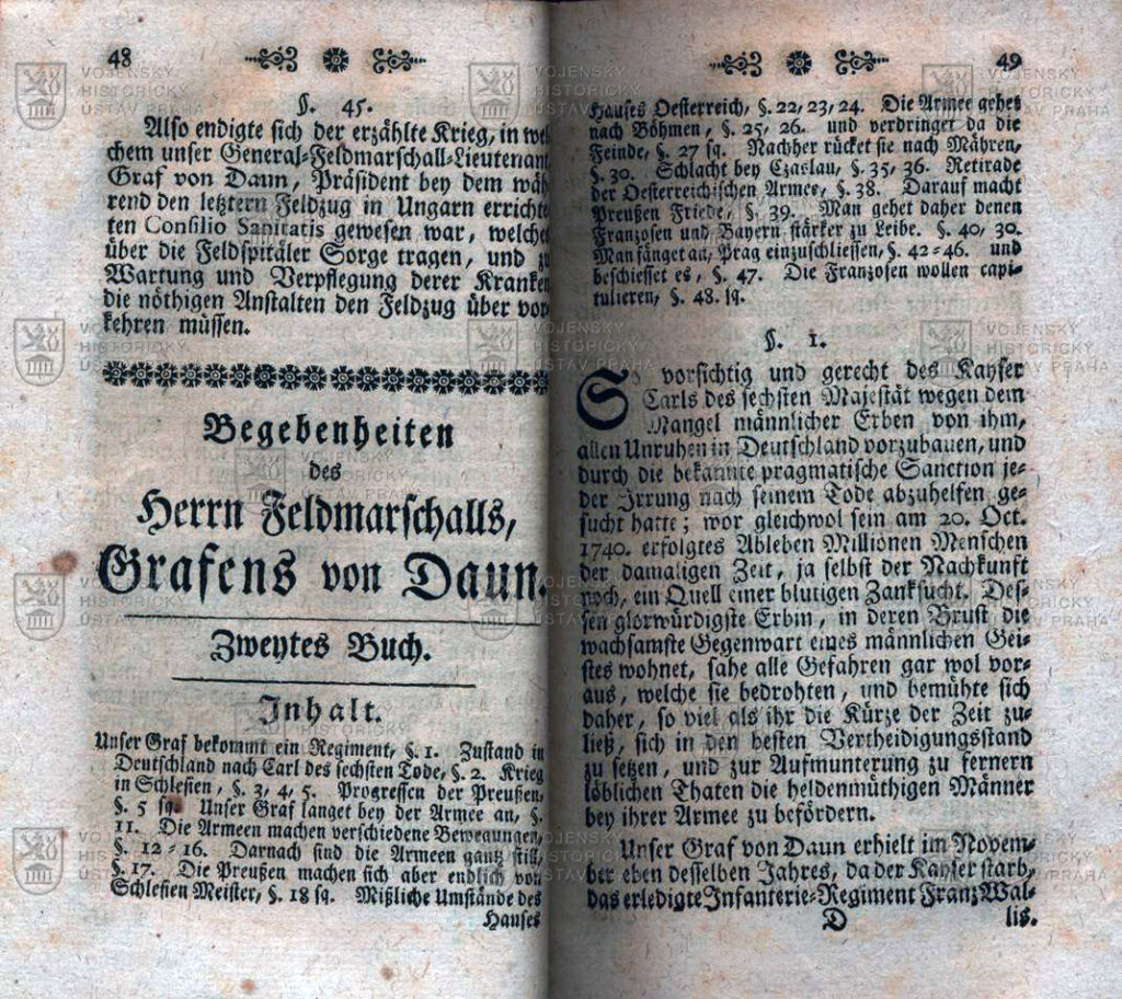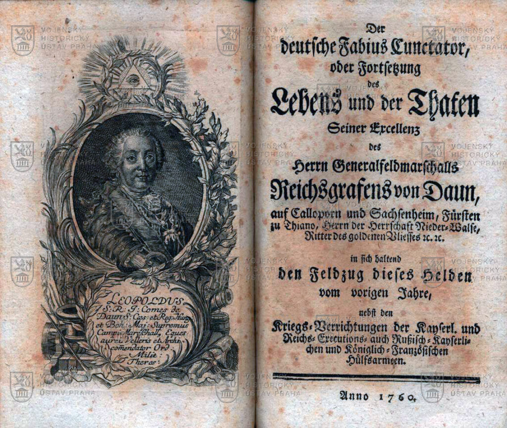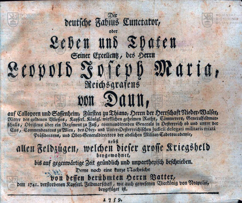 Der deutsche Fabius Cunctator, oder Leben und Thaten Seiner Excellenz, des Herrn Leopold Joseph Maria, Reichsgrafens von Daun, auf Calloporn und Saffenheim, Fürsten zu Thiano, Herrn der Herrschaft Nieder-Walsec, Ritter des goldenen Vliesses, Kaiserlich-Königlichen wirklichen geheim Raths, Kämmerers, Generalfeldmarschalls, Obristens über ein Regiment zu Fuss, commandirenden Generals in Oesterreich ob und unter der Ens, Commandantens zu Wien, des Ober- und Unter-österreichischen Iudicii delegati militaris mixti Präsidentens, und Ober-Generaldirectors der adelichen Militar-Cadetsacademie: nebst allen Feldzügen, welchen dieser grosse Kriegsheld beygewohnet, bis auf gegenwärtige Zeit gründlich und unpartheyisch beschrieben : deme noch eine kurze Nachricht von dessen berühmten Herrn Vater, dem 1741 verstorbenen kaiserlichen Feldmarschall, wie auch gewesenen Vicekönig von Neapolis, beygefüget ist. [S.l.: s.n.], 1759-1760. 2 sv.