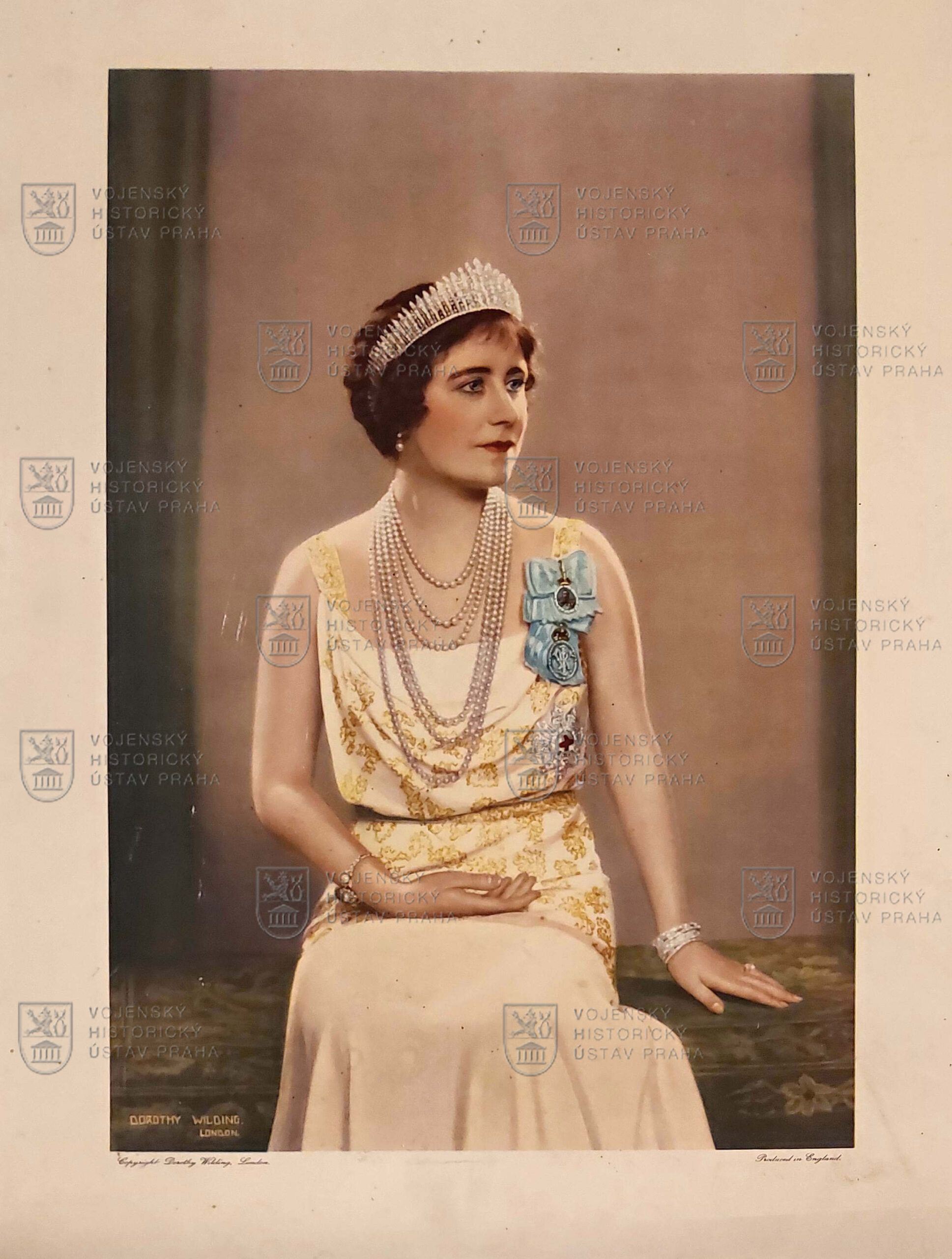 Autorkou portrétní fotografie britské královny Alžběty je Dorothy Wilding (1893–1976), která stala první ženou na pozici oficiální fotografky britské královské rodiny. V jejím ateliéru vznikl také portrét královnina manžela – Alberta vévody z Yorku, který v roce 1936 nastoupil na trůn jako Jiří VI. Zmíněný portrét královny se měl stát předlohou pro poštovní známky, vydané u příležitosti korunovace (v květnu 1937). Alžběta je na snímku zachycena s korunkou na hlavě, v uvolněné a zároveň důstojné atmosféře. Slavnostní róbu s nádhernou výšivkou zdobí perlový náhrdelník. Pro potřeby návrhů poštovních známek se dochovalo několik dalších portrétních variant. Při obdobné příležitosti v roce 1952 autorka vytvořila i portrét královny Alžběty II. Její matka požívala od této doby titul královna matka, aby byla jména obou osobností rozlišena.