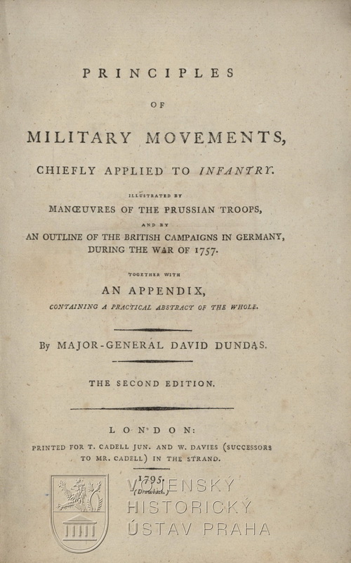 DUNDAS, David. PrinciplesofmilitaryMovements, chieflyapplied to infantry. London: T. Cadell Jun.; W. Davies, 1795. XVI, 234, 77 s.