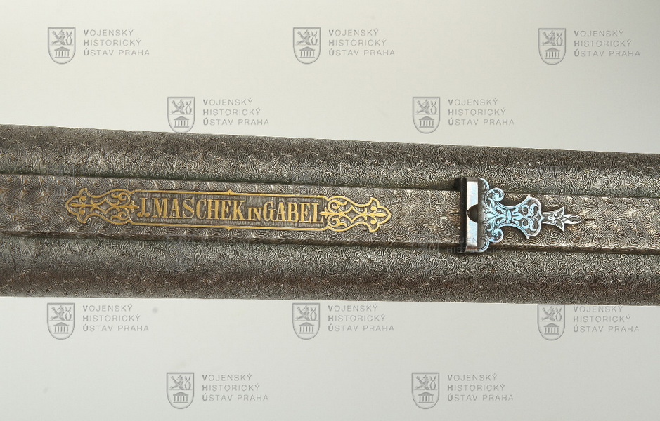 Válcové hlavně z damascénské oceli jsou opatřeny drážkovaným vývrtem a na středové plošině zlaceným nápisem „J. MASCHEK IN GABEL“. V zadní části je hlaveň zdobena rytými a částečně zlacenými florálními a lineárními ornamenty. U dnového šroubu pokračuje výzdoba také motivy figurálními, na palcovém štítku je proveden zlacený habsburský arcivévodský erb. Zámkové desky jsou po celé ploše zdobeny rytými rostlinnými ornamenty a rozsáhlejší loveckou scénou. Pravá deska je v kartuši opatřena zlaceným nápisem „MASCHEK“, levá nápisem „IN GABEL“. Puška je polopažbená, pažba z kvalitní ořechové kořenice je bohatě zdobena řezbou listových ornamentů a rybiny. Železné kování je po celé ploše zdobeno rytými a částečně zlacenými florálními a figurálními motivy. Na botce je mezi rytými ornamenty zakomponován letopočet „1854“. Zadní část lučíku je vyrobena z rohoviny. Dřevěný nabiják je opatřen pěchovákem a vytěrákem z bílého kovu.