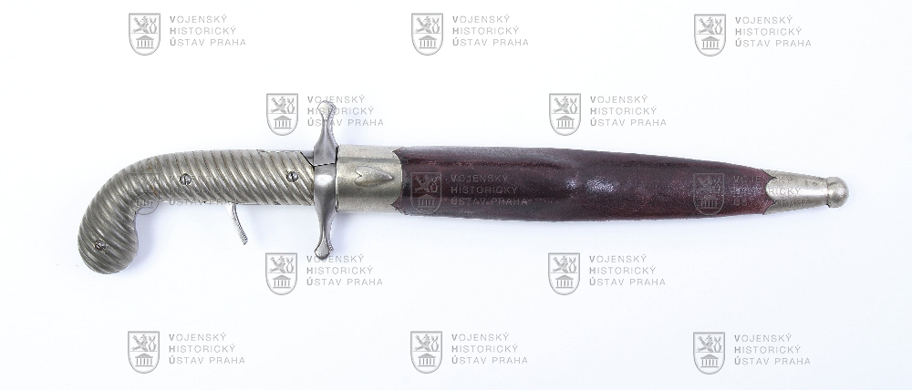 Představovaná kombinovaná dýka má přímou čepel s oboustranným středovým výbrusem. Na vnitřní straně je značena „DUMONTHIER BTE S.G.D.G.“ Po stranách čepele se nacházejí dvě válcové hlavně s hladkým vývrtem. Kanelované střenky z bílé mosazi jsou upevněny třemi šroubky s maticemi. Dvojitá přímá záštita má horná ramena sklopná, takže současně plní funkci kohoutů perkusních zámků. Pochva ze železného plechu je potažena kůží v barvě bordó a opatřena kováním z bílé mosazi.