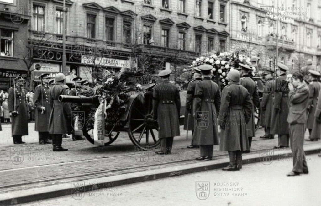Celý pohřební průvod se za zvuků smutečních pochodů plukovních hudeb a pozornosti široké veřejnosti ubíral Karmelitskou ulicí, přes most Legií a Národní třídou na Václavské náměstí k pomníku sv. Václava, kam dorazil o půl páté. Zde měl proslov ministr národní obrany František Machník. Po jeho skončení zamířili vojáci zpět do kasáren, zatímco lafeta pokračovala dále k novému krematoriu ve Strašnicích, kde se v pondělí 14. října konal vlastní pohřeb žehem. Urna s popelem byla následně slavnostně předána k uložení v prostorech Památníku osvobození.