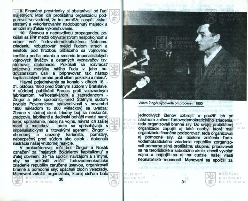 Viliam Žingor byl zatčen 27. listopadu 1949, obviněn z velezrady a spolu s dalšími zadrženými ho podrobili brutálním výslechům a mučení. Soud se konal až téměř po roce, ve dnech 19. – 21. října 1950. Celý proces byl dokumentován komunistickými médii a byl propagandisticky zneužit. Padly tři hrdelní rozsudky, pět obviněných dostalo sazbu od 12 let vězení po doživotí. Poprava Viliama Žingora, Ladislava Nosáka a Samuela Bibzi proběhla 18. prosince 1950. K revizi procesu došlo již v šedesátých letech a v dubnu 1968 rozhodl krajský soud v Bratislavě o zproštění žaloby pro všechny odsouzené. Vzhledem k nástupu normalizace se ale památka Viliama Žingora dočkala větší medializace až po roce 1989 a v létě 1990 byl Viliam Žingor in memoriam povýšen na generálmajora Československé armády.