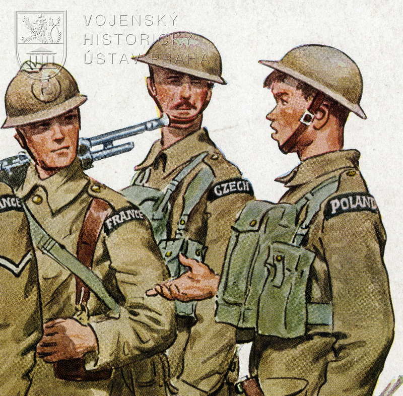 Za pozornost rozhodně stojí figura českého vojáka v britském stejnokroji s rukávovou nášivkou CZECH a německým popiskem Tscheche. Přítomnost slovenských vojáků v jednotce a skutečná podoba nápisu na nášivce (CZECHOSLOVAKIA) byla zřejmě s ohledem na spojenecký stát taktně přehlédnuta. Stejně tak barevné provedení nášivky odpovídá spíše označení československých letců v řadách RAF. Nicméně se jedná o velice zajímavý doklad, jenž přiznával existenci československé exilové jednotky. Výtvarná podoba českého vojáka pak vyznívá mnohem příznivěji, než u jeho polského kolegy.