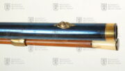 Na krku pažby je stříbrný maskaron a další dva malé maskarony jsou po stranách jazýčku dnového šroubu. Posledním, krásně řezaným maskaronem je pak zakončen dlouhý krk pažby. Hlaviště pažby je opatřeno lícnicí. Pod předpažbím je dřevěný nabiják s rohovinovým pěchovákem, který fixuje jedna mosazná objímka pod hlavní a dvě ocelové objímky v předpažbí.