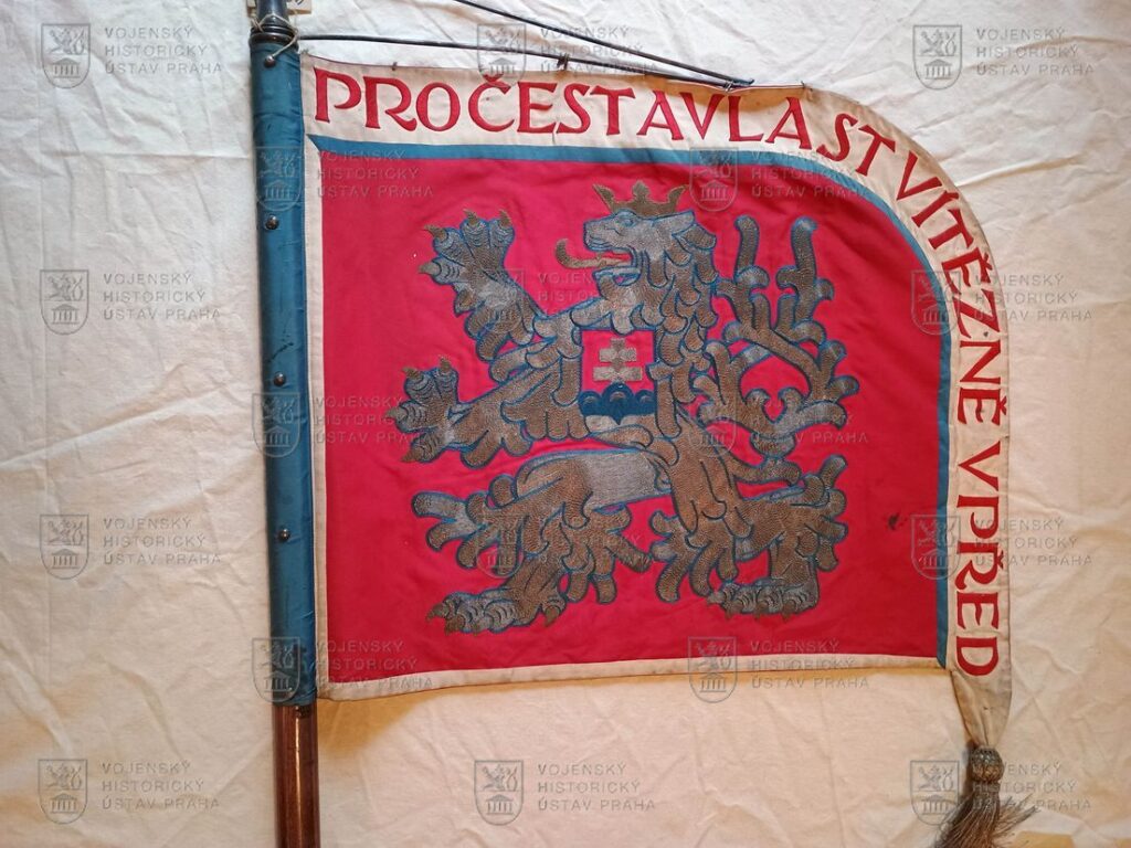 Pole listu z lícové strany je červené barvy s bílým lemem odděleným tenkým modrým pruhem. Uprostřed listu je vyobrazen malý státní znak. Československý lev s konturami z modrého hedvábí je aplikován stříbrným brokátem, se zlatými zbraněmi a korunou. V horním a vlajícím bílém okraji je vyšit červeným hedvábím nápis: „PRO ČEST A VLAST VÍTĚZNĚ VPŘED“.