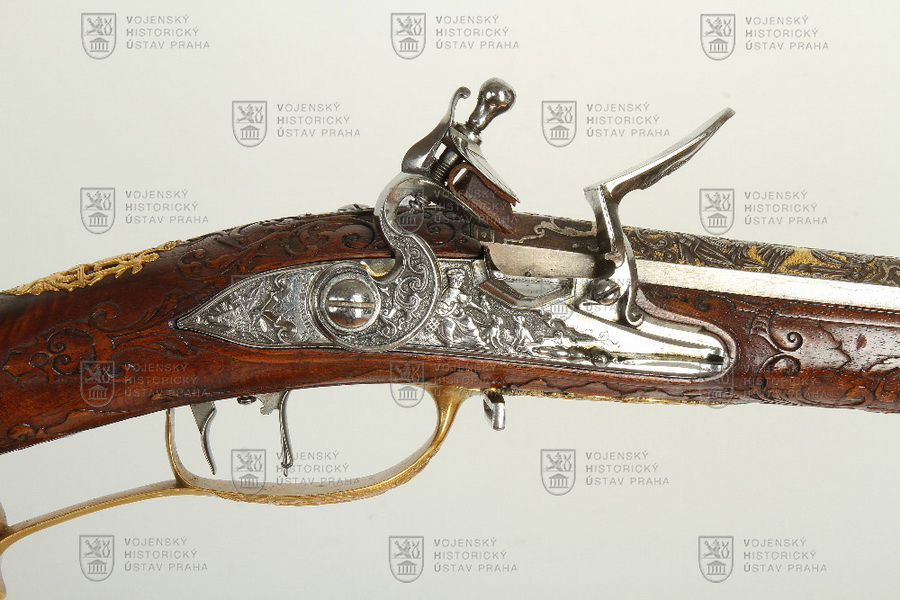 Garnitura mosazná, zlacená v ohni. Na prořezávané protidesce dominuje figura muže v antickém oděvu na voze taženém lvy. Na krku pažby oválný palcový štítek se zdrsněným povrchem, na kterém jsou obrysy nezřetelného monogramu, vavřínového věnce a orlice. Nad palcovým štítkem je knížecí koruna, štít nesou dva putti, pod štítem jsou trofeje (bubny, dělové hlavně) a na nich sedí dva spoutaní zajatci. Lučík kryje spoušť s napínáčkem. Na spodní straně lučíku dominuje postava antického válečníka s rozpaženýma rukama, který stojí na trofejích. Vpředu na prodloužení lučíku je opět motiv trofejí v kombinaci s rostlinnými ornamenty. Na horní části botky je mezi řadou akantů na zdrsněném podkladu motiv antického bojovníka na vzpínajícím se koni.