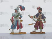 Během Šmalkaldské války byly páteří vojsk obou válčících stran landsknechti, pěší žoldnéři typičtí pro období 16. století a známí mimo jiné svými pestrobarevnými oděvy. Prezentované figurky představují dvojici landsknechtských velitelů v přiléhavých kabátcích, v punčochách pod kolena a v tzv. plundrách, výrazně nabíraných nohavicích, které byly typické pro landsknechty cca od roku 1540 až do konce století. Jeden z velitelů je oděn do kyrysu s nárameníky a tzv. zbrojními šosy na stehnech a hlavu má chráněnou tzv. útočnou přilbou (Sturmhaube) s chocholem. Druhý velitel je pouze v oděvu, přes nějž má krátký modrošedý pláštík s bílým lemováním s červenými prostřihy ve tvaru X (kříž sv. Ondřeje) a na hlavě nese černý klobouk s barevným peřím. Oděvům obou velitelů dominuje červená, modrá, vínová a zelená barva. Oba velitelé mají na opasku meče a jejich hodnost je zdůrazněna příslušným atributem – u velitele v oděvu je to krátká hůl, u velitele ve zbroji se jedná o zelenou šerpu nesenou šikmo přes hruď a o válečné kladivo ve svěšené ruce. Hlavice kladiva byla ovšem evidentně omylem přetřena modrou barvou nohavic a proto není na první pohled zcela patrná.