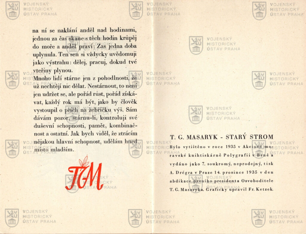 Neprodejný tisk vydaný v den Masarykovi abdikace obsahuje lyrickou esej o stárnutí. Ústředním motivem je úvaha, v níž končící prezident přirovnává stárnutí stromu k ideálu stárnutí člověka. Jeho schopnosti a velikost mají s každým rokem mohutnět, stejně jako devítisetletý dub, ve kterém je více života než v malých stromcích. Text končí symbolickou větou: „Jak bych viděl, že ztrácím některou hlavní schopnost, udělám hned místo mladším.“ Tato věta odráží i konec úctyhodné politické kariéry prvního československého prezidenta.