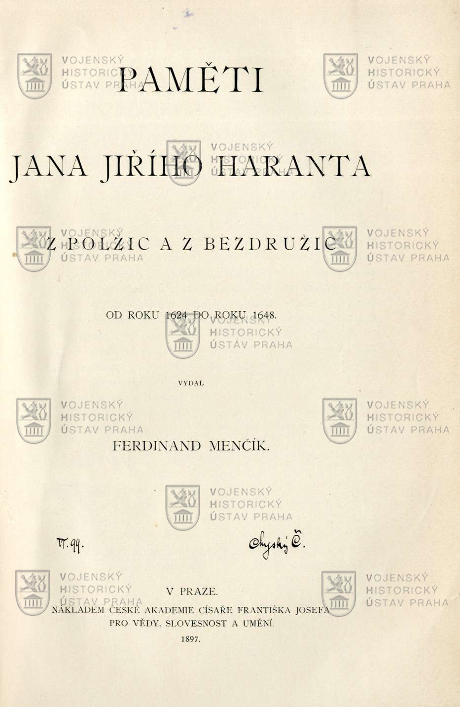 MENČÍK, Ferdinand (ed.). Paměti Jana Jiřího Haranta z Polžic a z Bezdružic: od roku 1624 do roku 1648. Historický archiv (Česká akademie císaře Františka Josefa pro vědy, slovesnost a umění). Praha: Česká akademie císaře Františka Josefa pro vědy, slovesnost a umění, 1897.