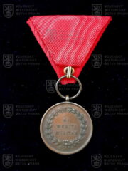 Na středu je umístěn nápis: AL MERITO MILITAR (vojenské zásluze). Nápis je obkroužen dvěma vavřínovými ratolestmi, převázanými ve spodní části a uzavřenými téměř do tvaru věnce.