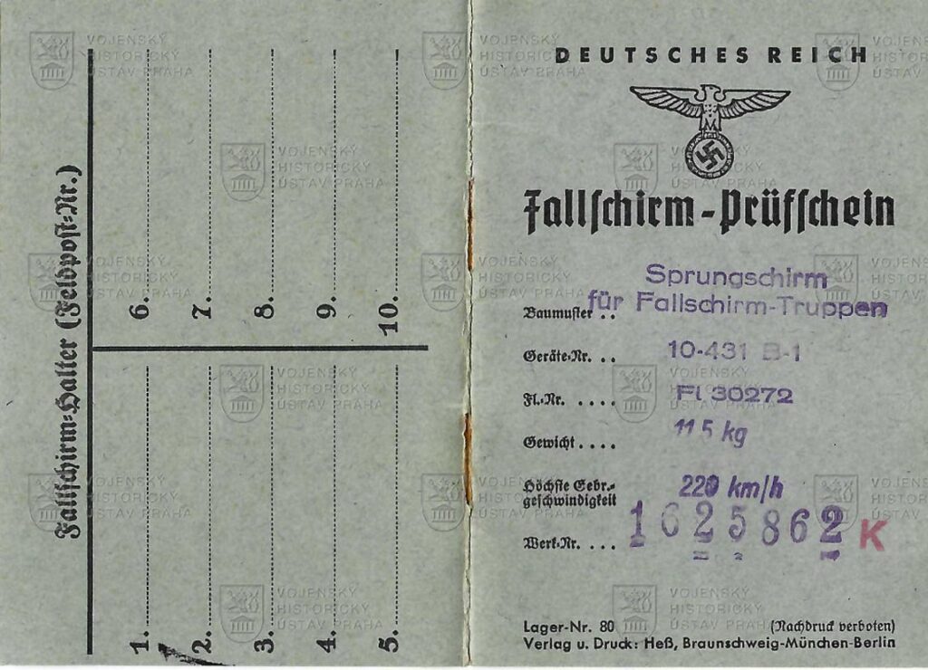 Jeho celtovinové khaki díly měly původní výrobní štítky, hedvábný vrchlík byl maskovaný, hedvábné nosné šňůry bílé, a to včetně šňůry výtažné. Veškeré ocelové kování i rychlozámky nesly povrchovou ochranu proti korozi. Hmotnost celé sestavy i s brašnou činila 11,5 kg.
