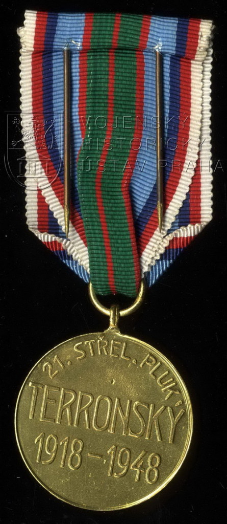 Na středu nápis: TERRONSKÝ / 1918-1948. Při mírně plasticky převýšeném okraji volně v ploše opis: 21. STŘEL. PLUK.